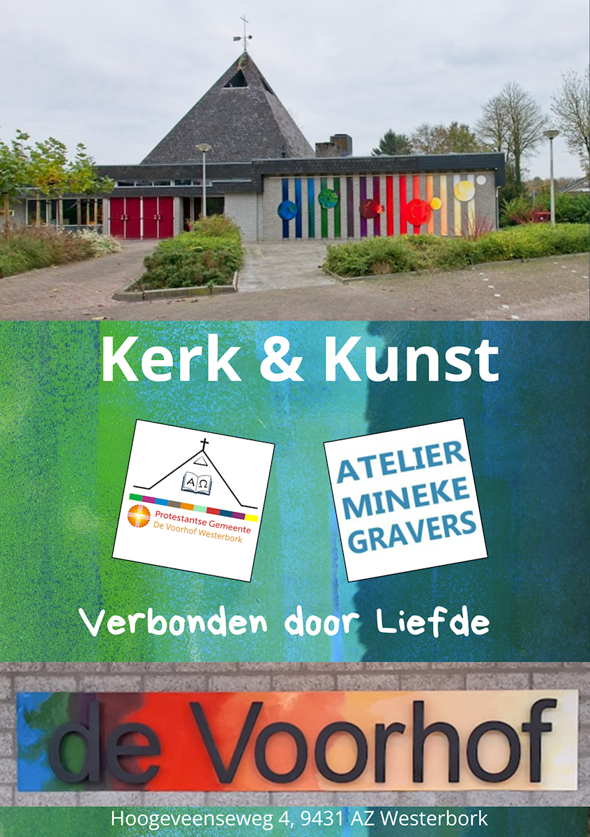 Opvallend is ook het prachtige kunstwerk “In Vuur en Vlam” van Mineke Gravers, dat voor in de kerkzaal hangt. Op 10 november 2024 werd het kunstwerk ‘Verbonden door Liefde’, zichtbaar aan de buitenkant van het gebouw, feestelijk onthuld tijdens de viering van het 50-jarig bestaan van De Voorhof. Uitleg hierover staat, samen met de andere kunstwerken in de Voorhof, beschreven in het boekje Kerk en Kunst.